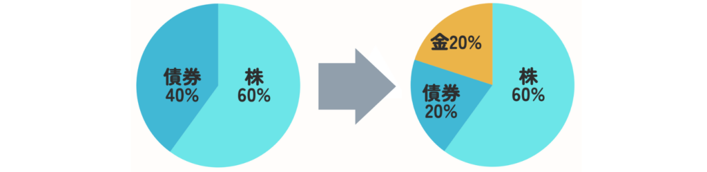 そこで近年注目されているのが「60%株式、20%債券、20%金」の新モデルです。