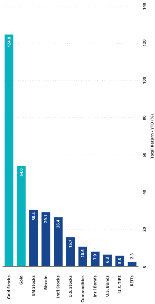 2025年に入って、金価格はドル建てでおおよそ前年同期比50%以上の上昇を記録し、記録的な買いが集中しています。