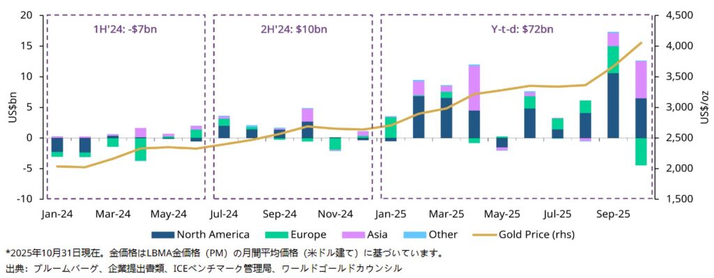 実際、世界最大の金ETF「SPDR Gold Shares(GLD)」の保有残高は、2025年10月以降に約5%減少。