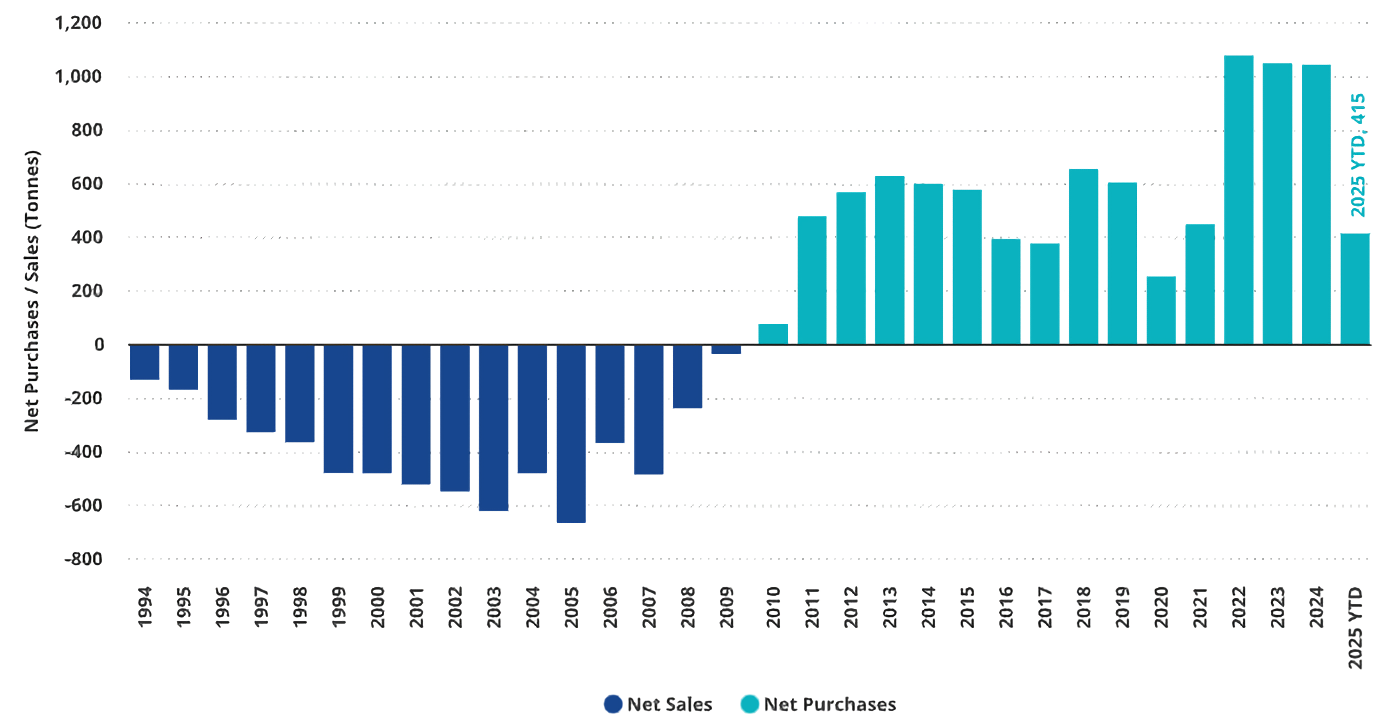 世界金協会(WGC)のレポートによると、2023年・2024年の中央銀行の金購入量は2年連続で1,000トンを超過。