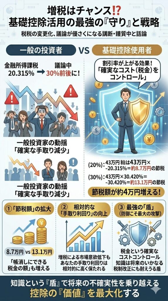 もし、増税が現実のものとなれば、一般の投資家は手取りを大きく減らすことになりますが、基礎控除を活用するあなたにとっては話が別です。