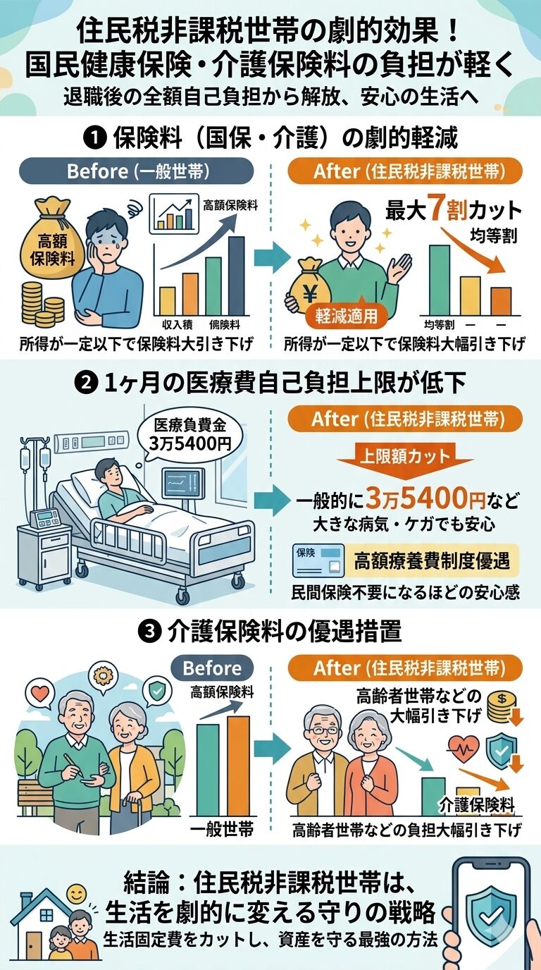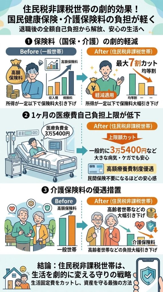 特に国民健康保険料(国保)は所得に応じて高額になりがちですが、住民税非課税世帯になることで、この負担が「劇的」に軽くなります。