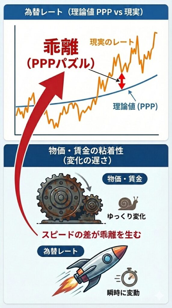 それは、為替が動くスピード(一瞬)に対し、実際のモノの値段や私たちの給料(物価・賃金)が変わるスピードが圧倒的に遅い「粘着性」があるからです。