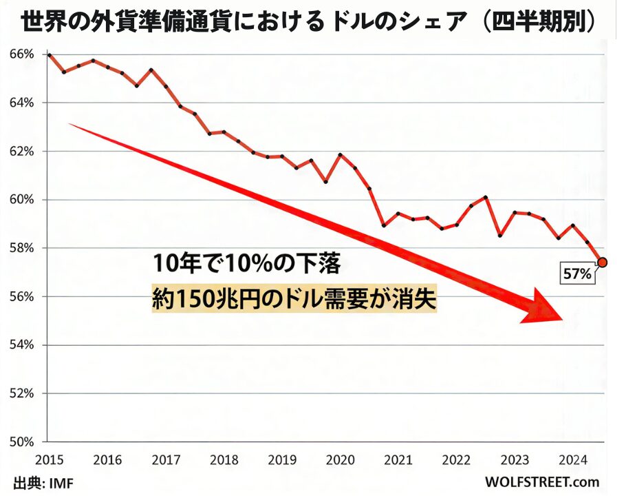 これは「ちょっとした変動」ではなく、世界中の国々が「資産をドルだけで持つのはリスクだ」と考え、他の通貨や資産へ分散投資を始めている明確なサインです。