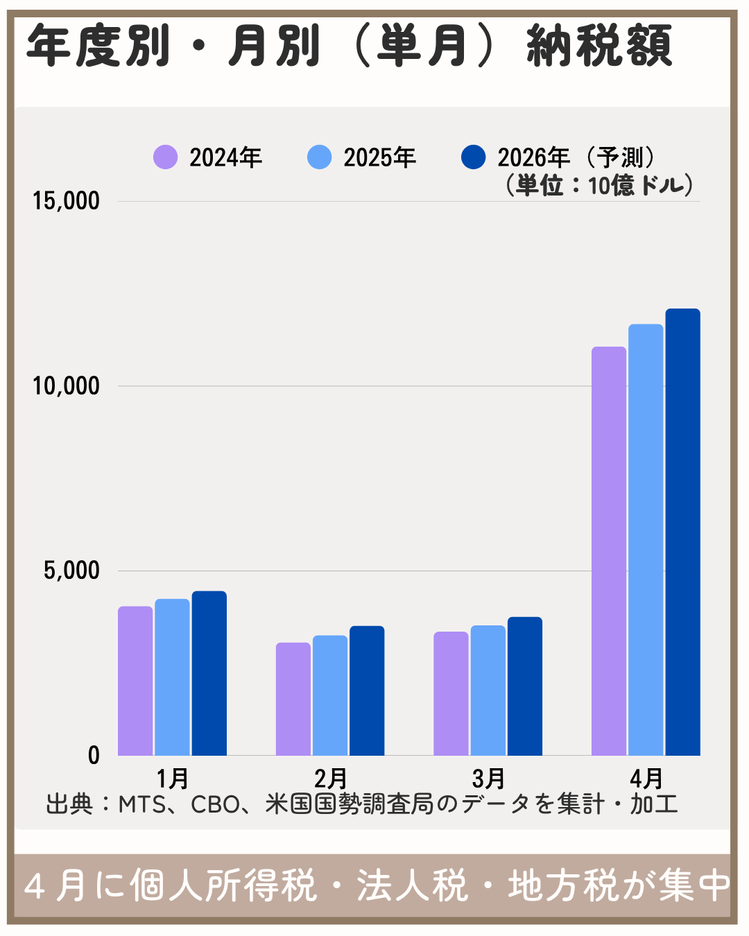 米国では個人所得税法人税、そして複数の地方税の納税期限が重なり、市場から天文学的な規模の資金が「納税」という形で消えていきます。