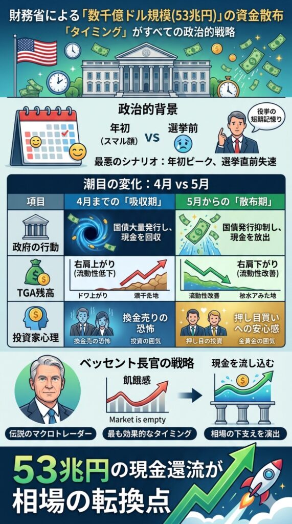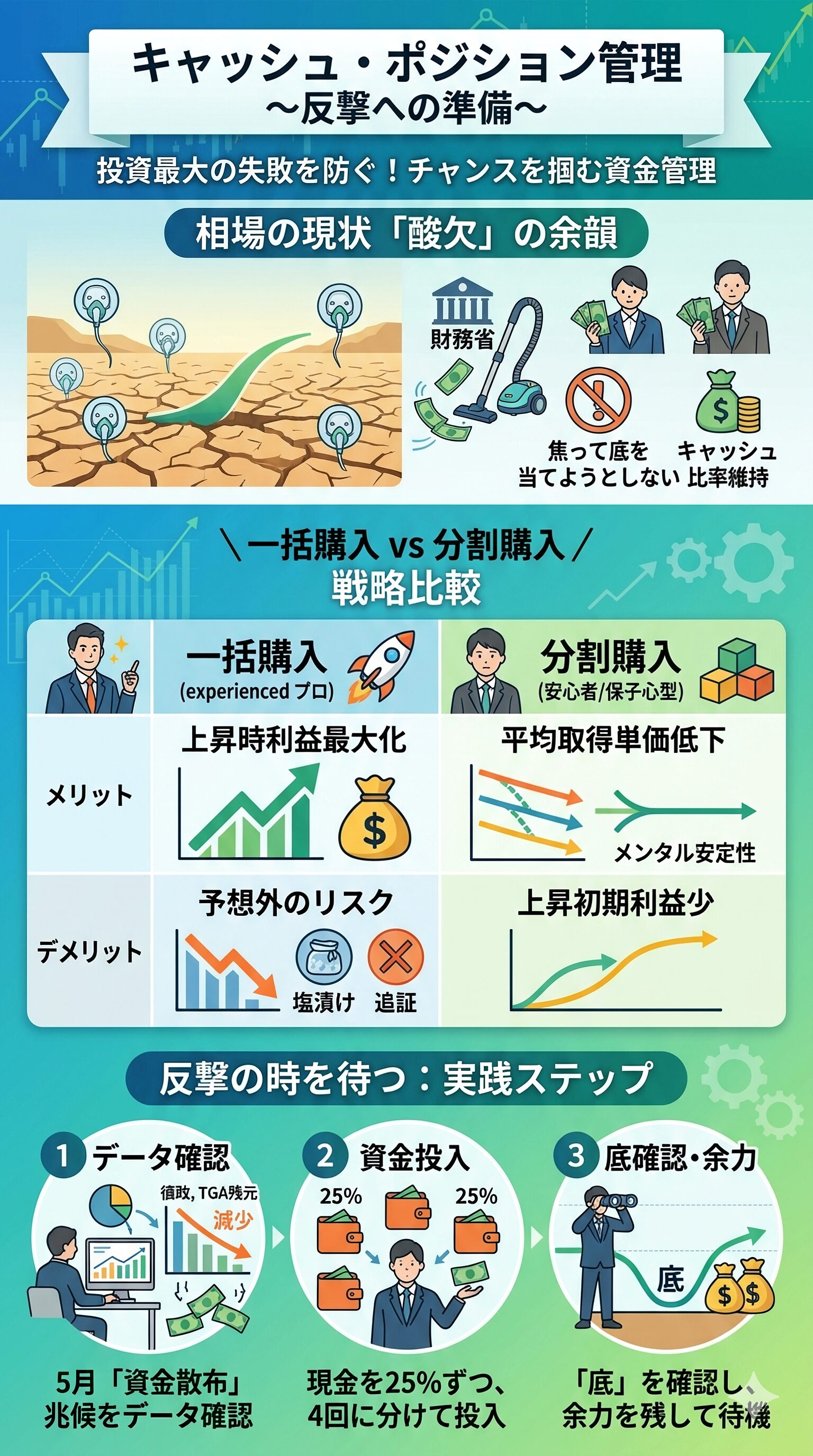 5月の「資金散布」の兆候(財務省のTGA残高減少)をデータで確認してから、手元の現金を25%ずつ、4回に分けて投入するイメージで構えましょう。