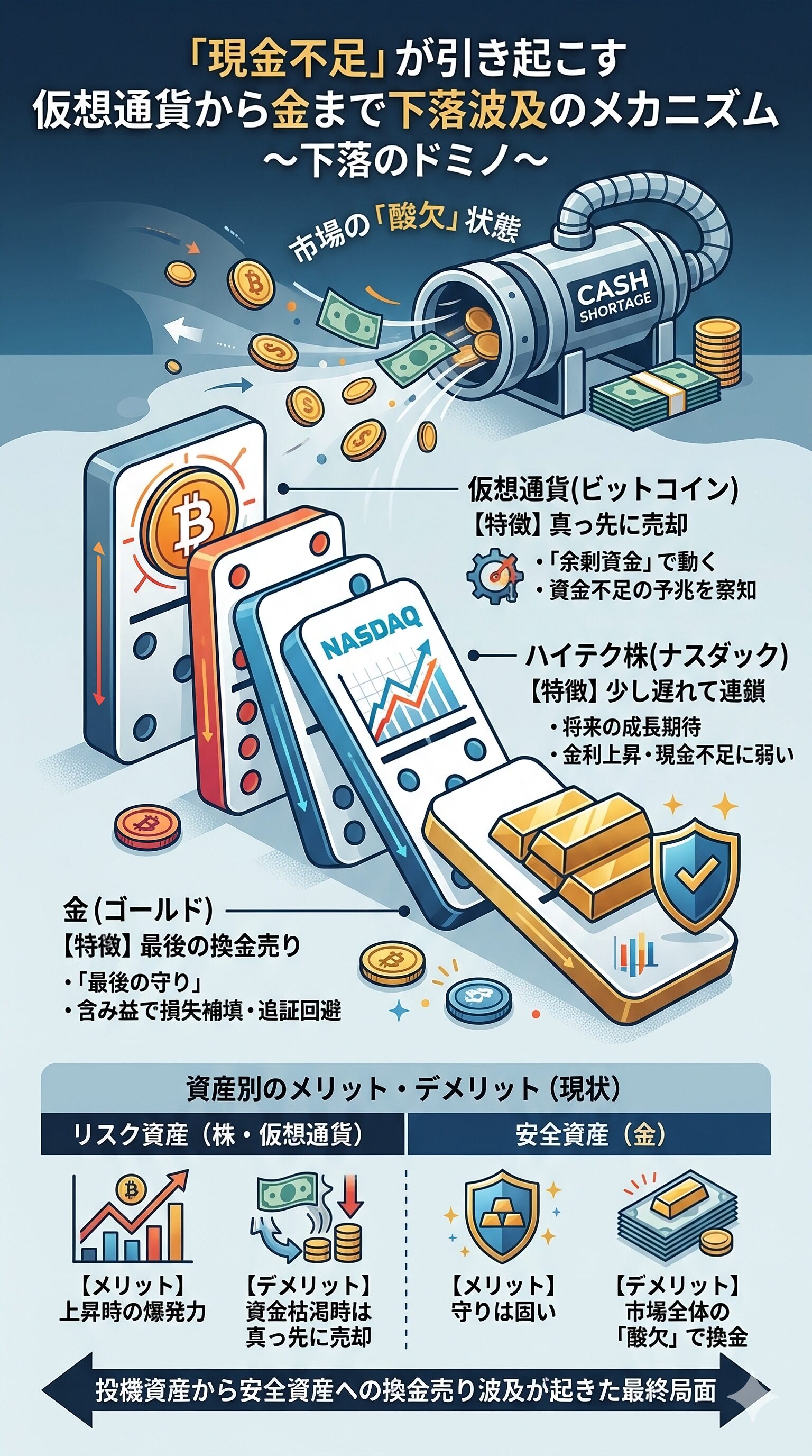 • ビットコイン(仮想通貨): 実体経済への影響が少なく、最も「余剰資金」で動く資産。資金不足の予兆をいち早く察知し、真っ先に売却されます。