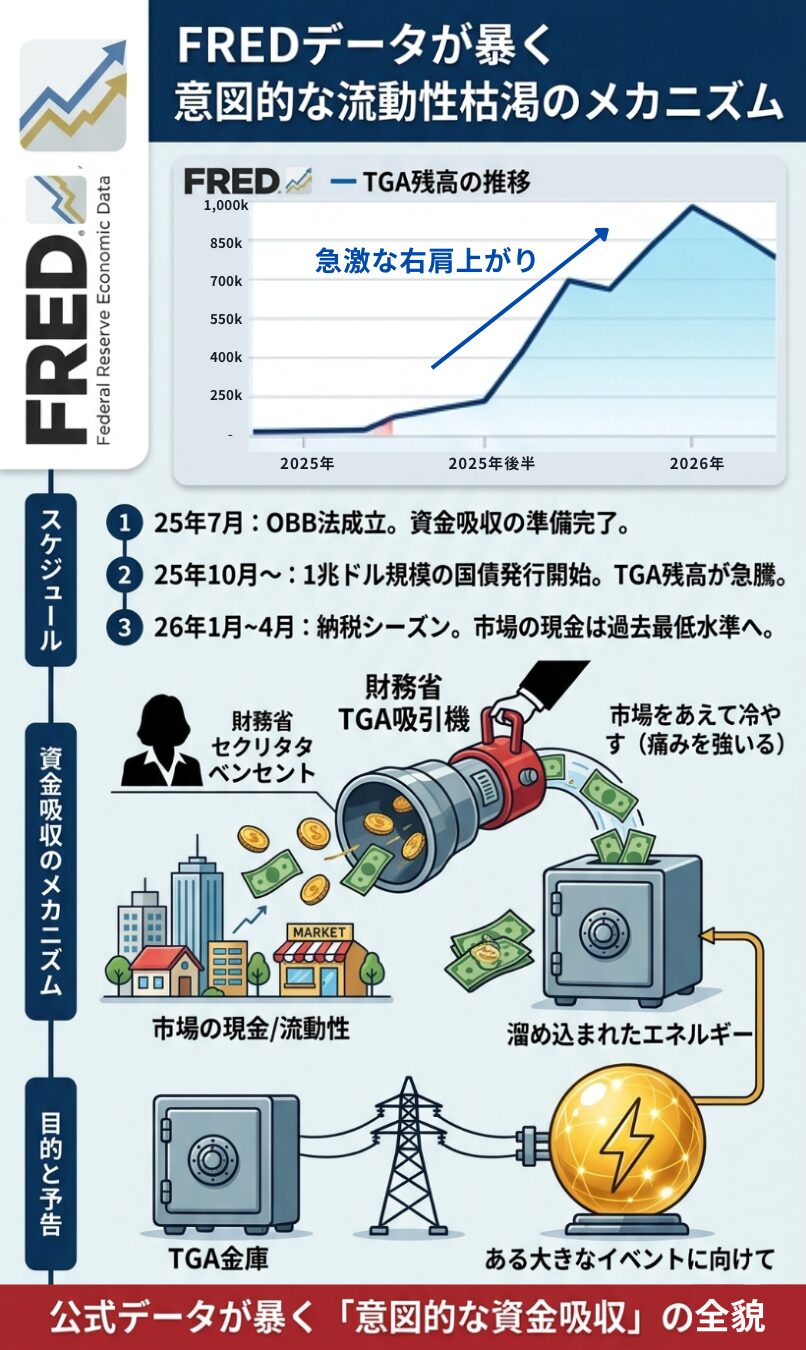 多くの初心者が恐怖で資産を手放す中、この記事を読んだあなたは、市場の裏側にある「巨大な金庫(TGA)」と「資金の蛇口(OBB法)」の存在を知っています。