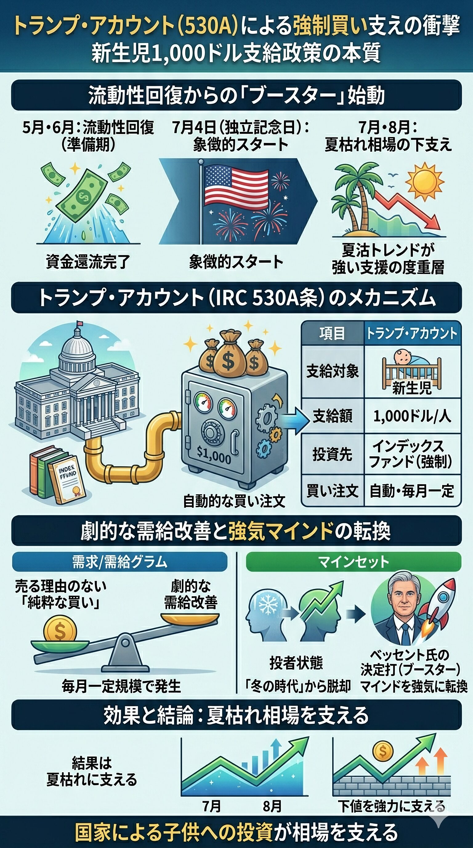 流動性が回復した5月・6月の先に待っているのが、7月4日の独立記念日を象徴的なスタートとする「トランプ・アカウント(IRC 530A条)」の始動です。