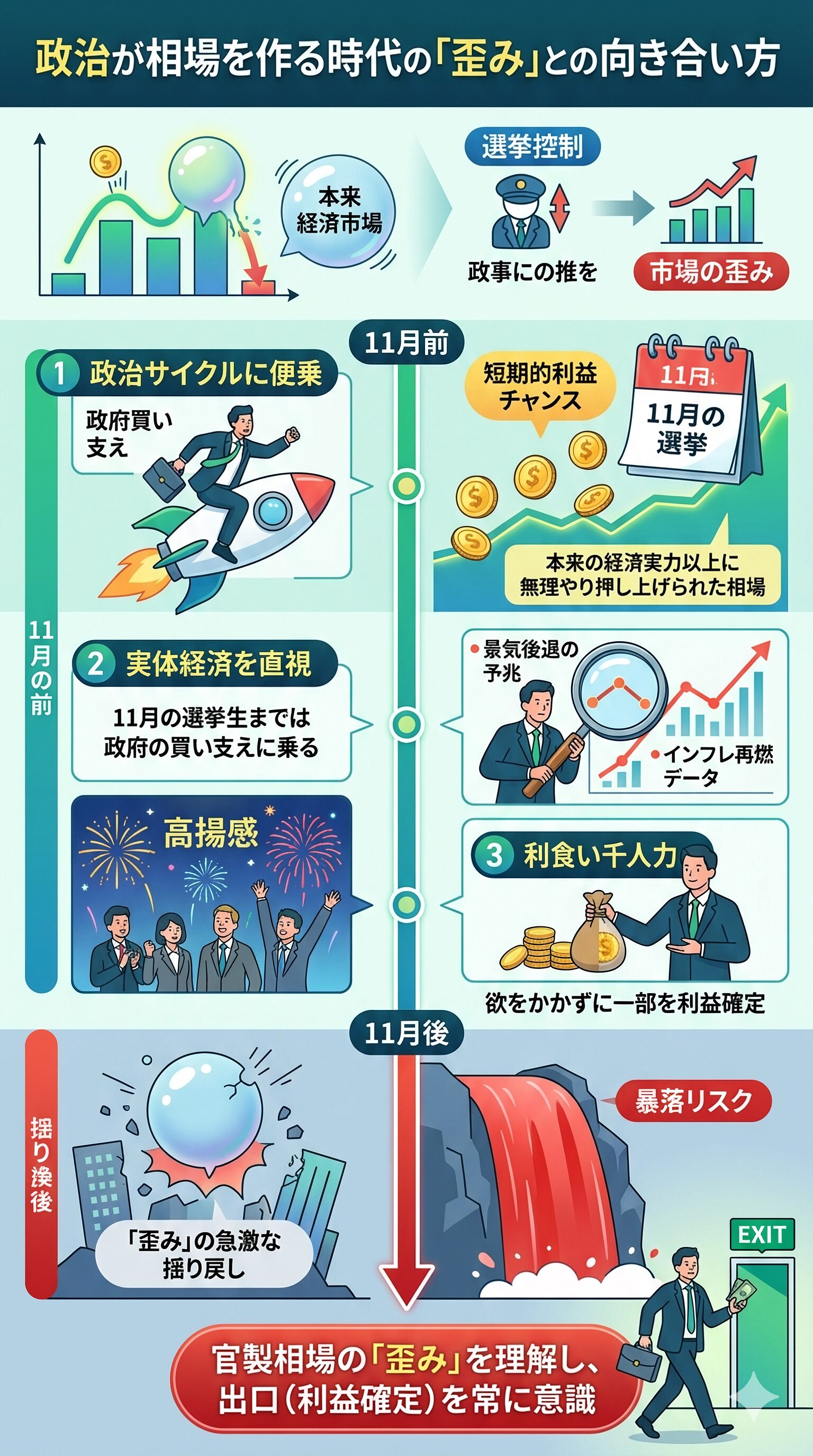 「選挙のために相場がコントロールされている」という事実は、短期的な利益チャンスである一方、中長期的には大きな「市場の歪み」を生みます。