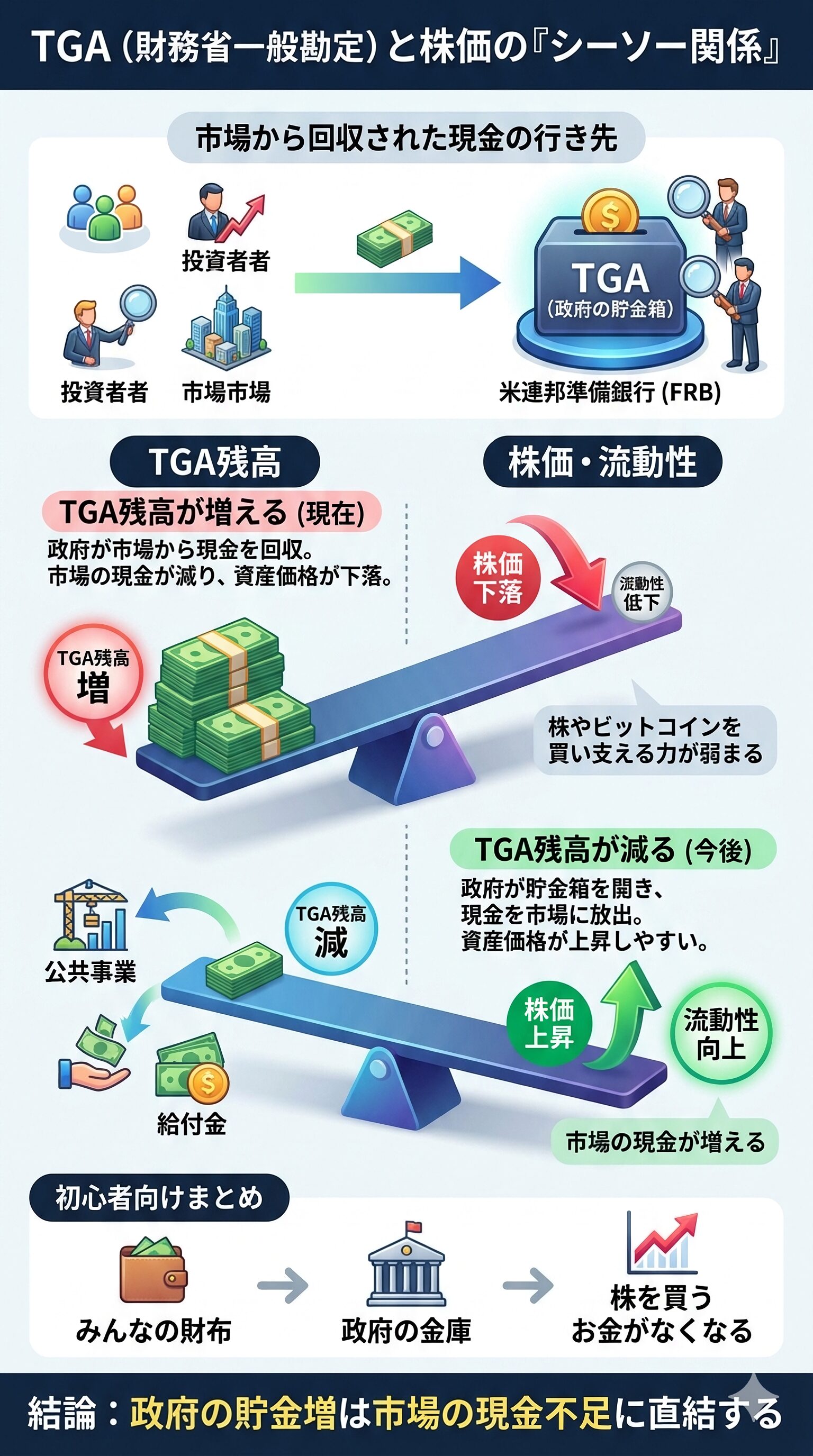 • TGA: (Treasury General Account:財務省一般口座)は、米国財務省が連邦準備銀行(FRB)に保有する、アメリカ政府の主要な運営口座です。文字通り「政府の金庫」として機能しています。
