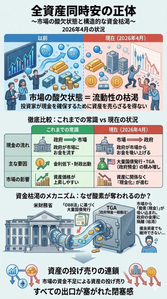 • 安全資産(金): 守りは固いが、市場全体の「酸欠」が極まると換金売りの対象になる。
