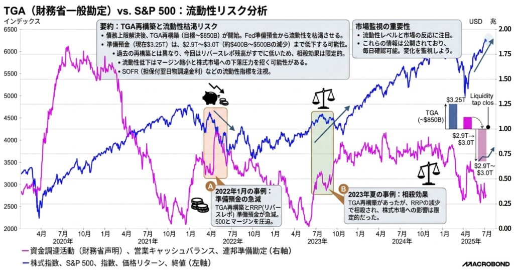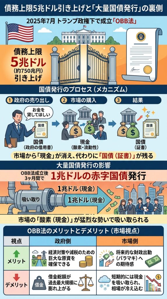 米財務省が「OBB法」に基づき大量に国債を発行した結果、本来なら市場で投資に使われるはずの資金が、政府の金庫(TGA)へと吸い込まれてしまいました