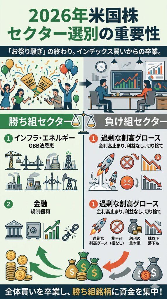 この時期の相場は、指数(S&P500など)全体が上がる「お祭り騒ぎ」ではなく、勝ち組」と「負け組」がはっきりと分かれるのが特徴です。
